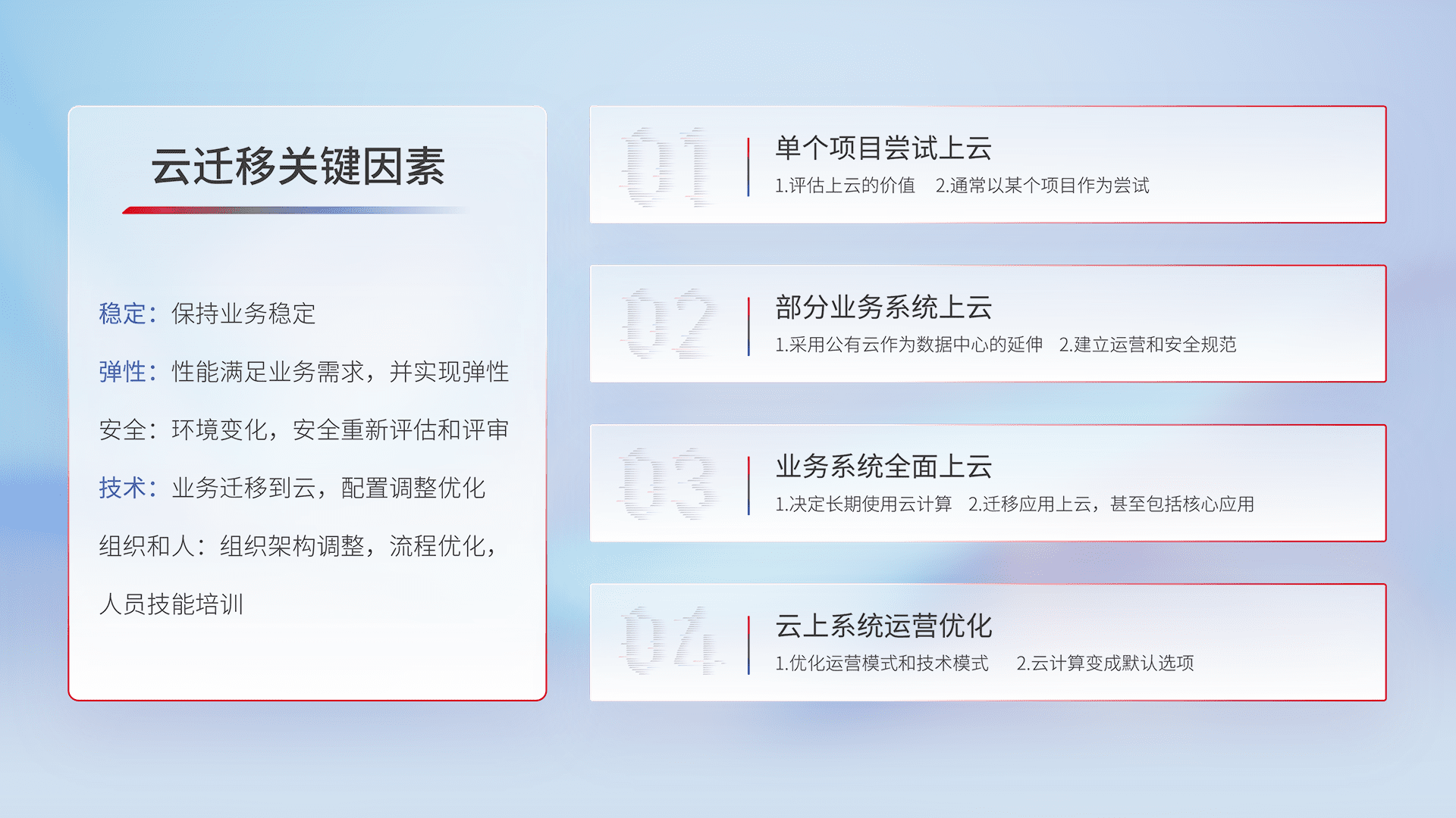 结合实际业务,,,从规划设计、、、、云平台选型、、云原生改造、、数据迁移、、集成交付,,,迁移全过程为客户识别最佳上云路径,,做好风险识别管理,,,设计网络架构、、身份权限、、安全审计合规、、、操作审计、、、日志审计、、监控告警策略、、、多站点容灾设计等,,对云上基础设施进行整体规划,,,,提升IT治理水平,,以满足弹性、、、高可用、、、、高性能的需求。。